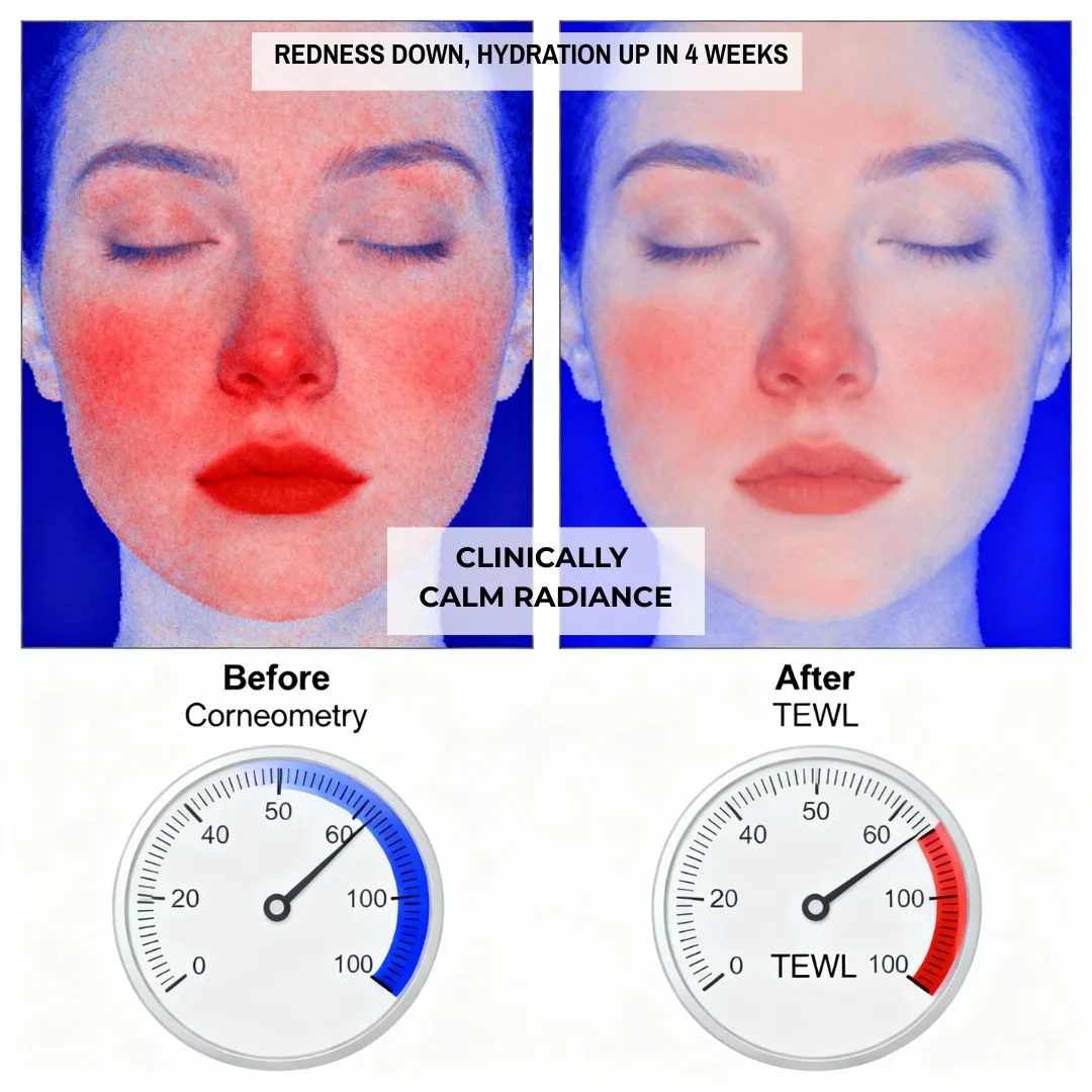We formulated the Radiance Fluide™ to be the solution. We needed a clinical ‘silk-serum’ that could deliver *instant* glassy dew (the ‘Radiance’) while also providing *long-term* visible redness reduction (the ‘Calm’).